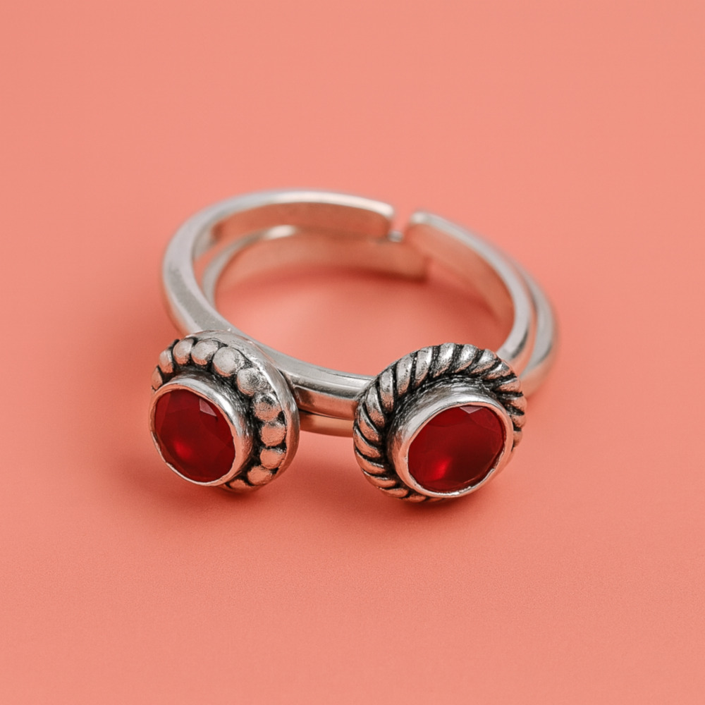 These toe rings feature a bold round red gemstone set in an antique-style oxidized silver band.