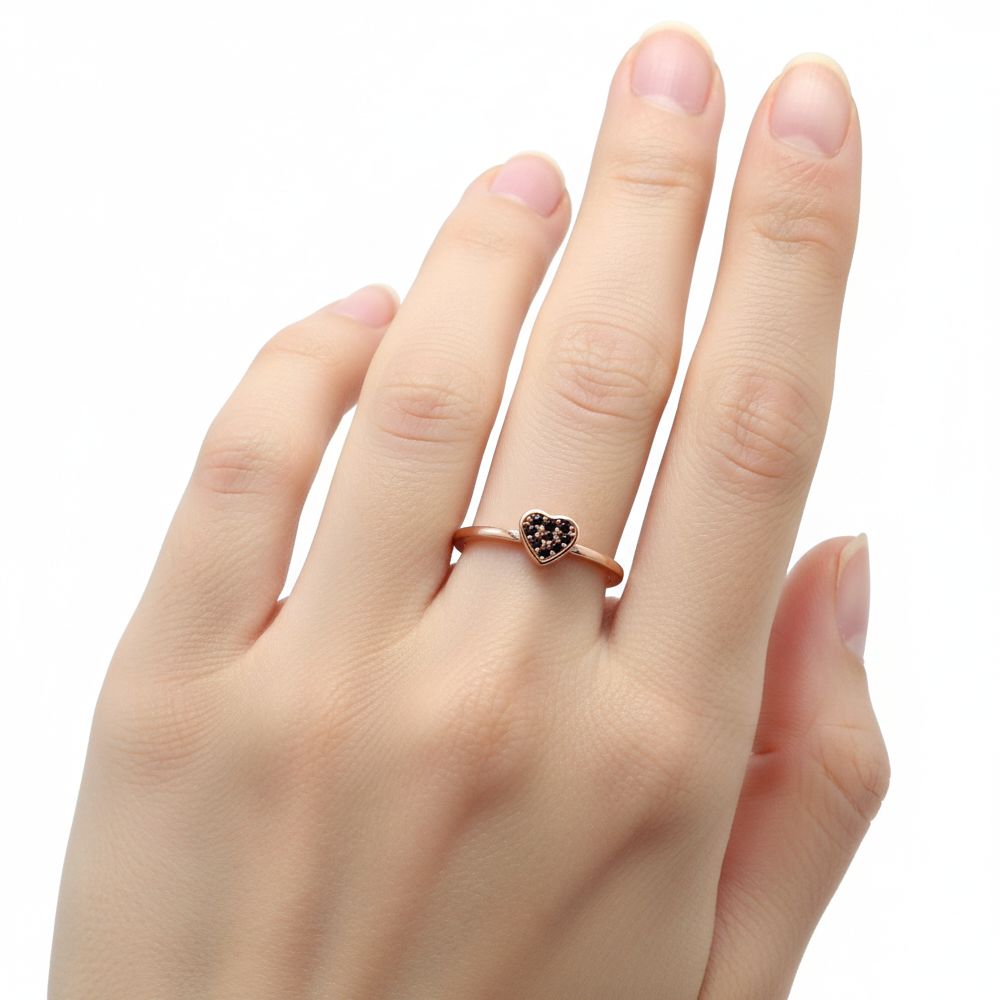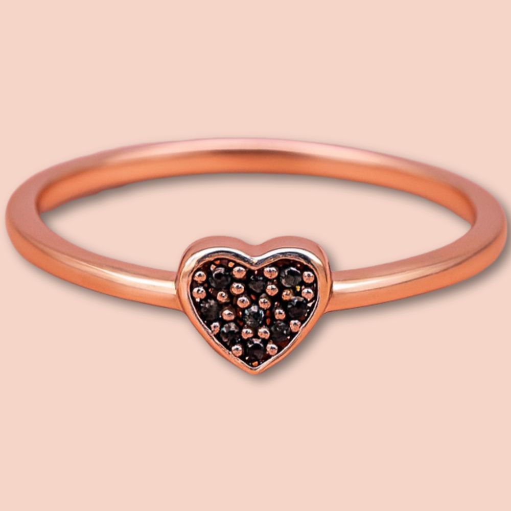 This Rose Gold-Tone Ring Features A Heart-Shaped Design Adorned With Shimmering Black Stones.