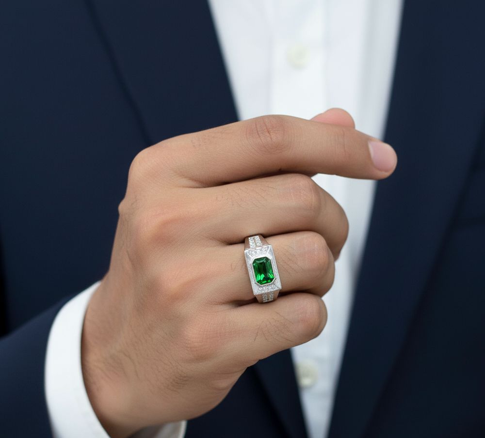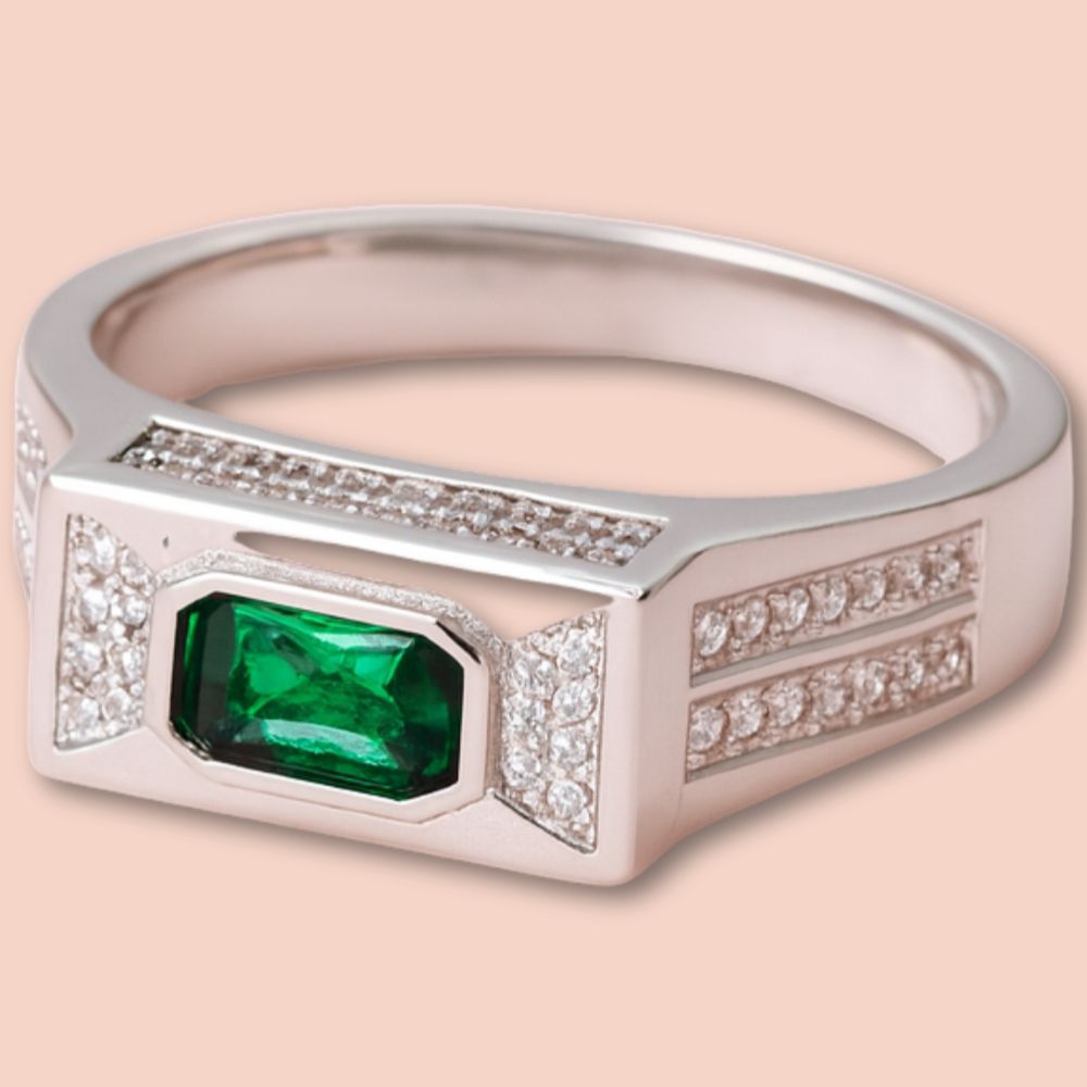 The Ring Features A Bold Emerald-Cut Green Gemstone As The Centerpiece Set In A Rectangular Frame Of Polished White Metal Size-20