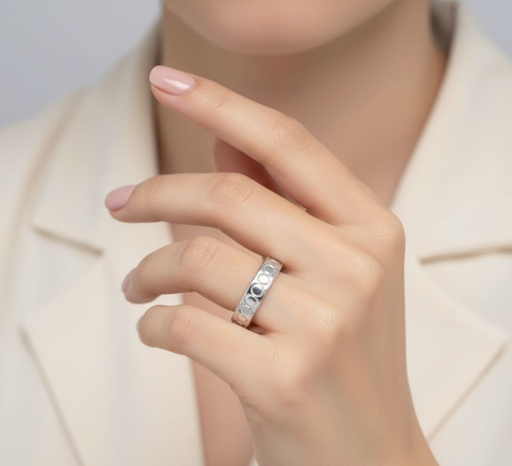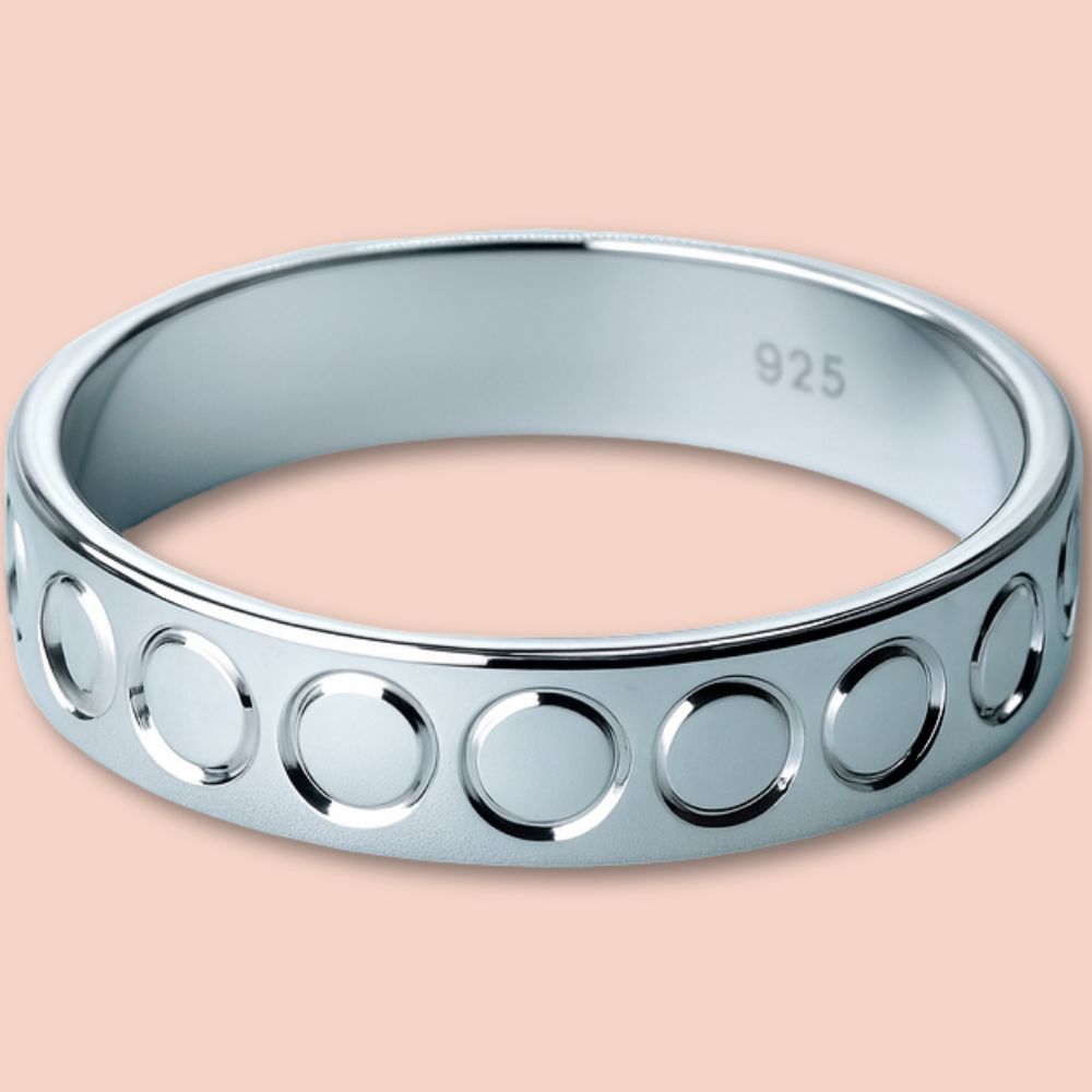 The Ring Features a Continuous Pattern Of Circular Motifs Around The Band Giving It A Sleek, Modern And Minimalist Aesthetic.