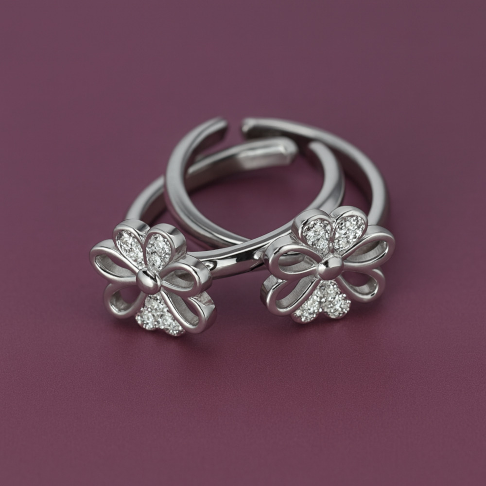 These toe rings a five-petal flower design with sparkling stone embellishments on each petal, arranged around.