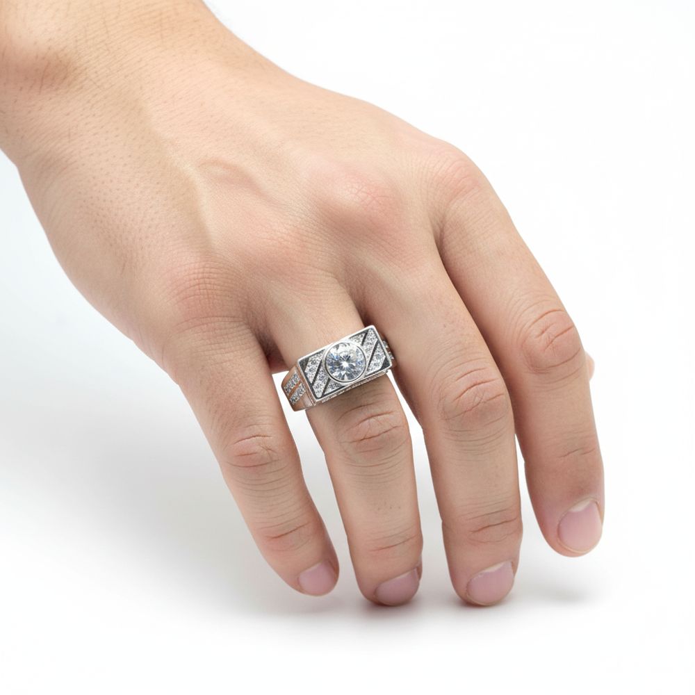 Make A Bold Impression With This Mens Statement Ring Featuring A Dazzling Round-Cut Centre Stone.