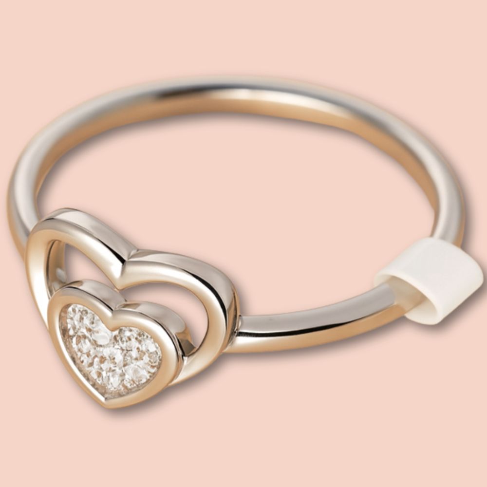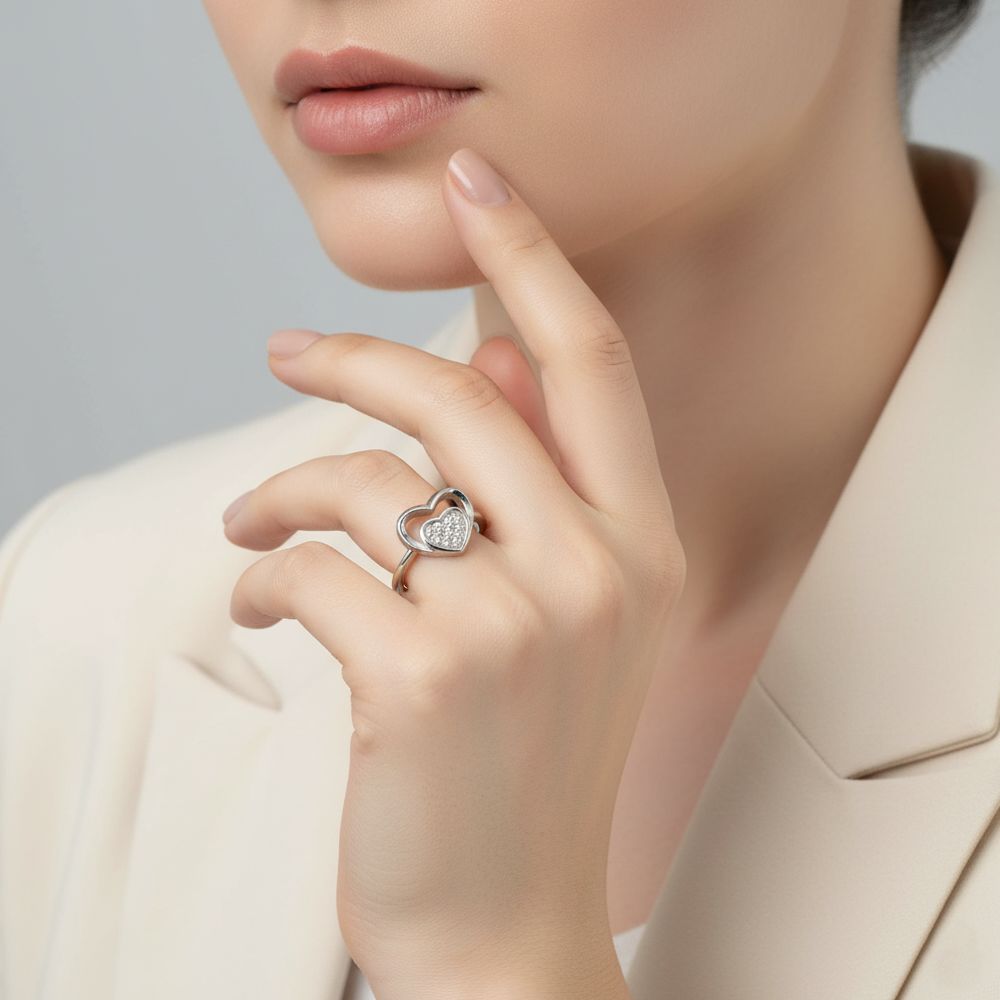 A Charming And Romantic Womens Ring Featuring Two Interlocked Hearts -One Crafted In Polished Metal. Size- 14