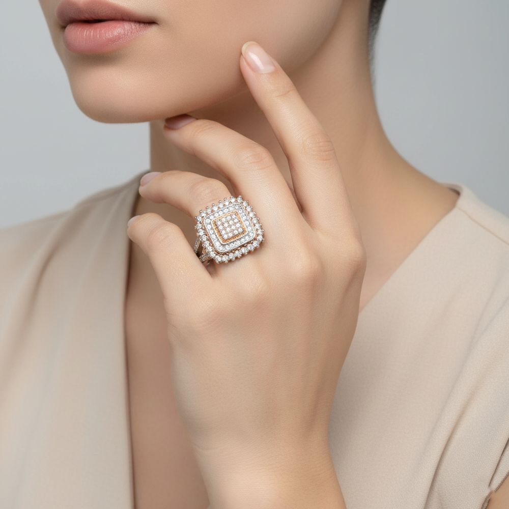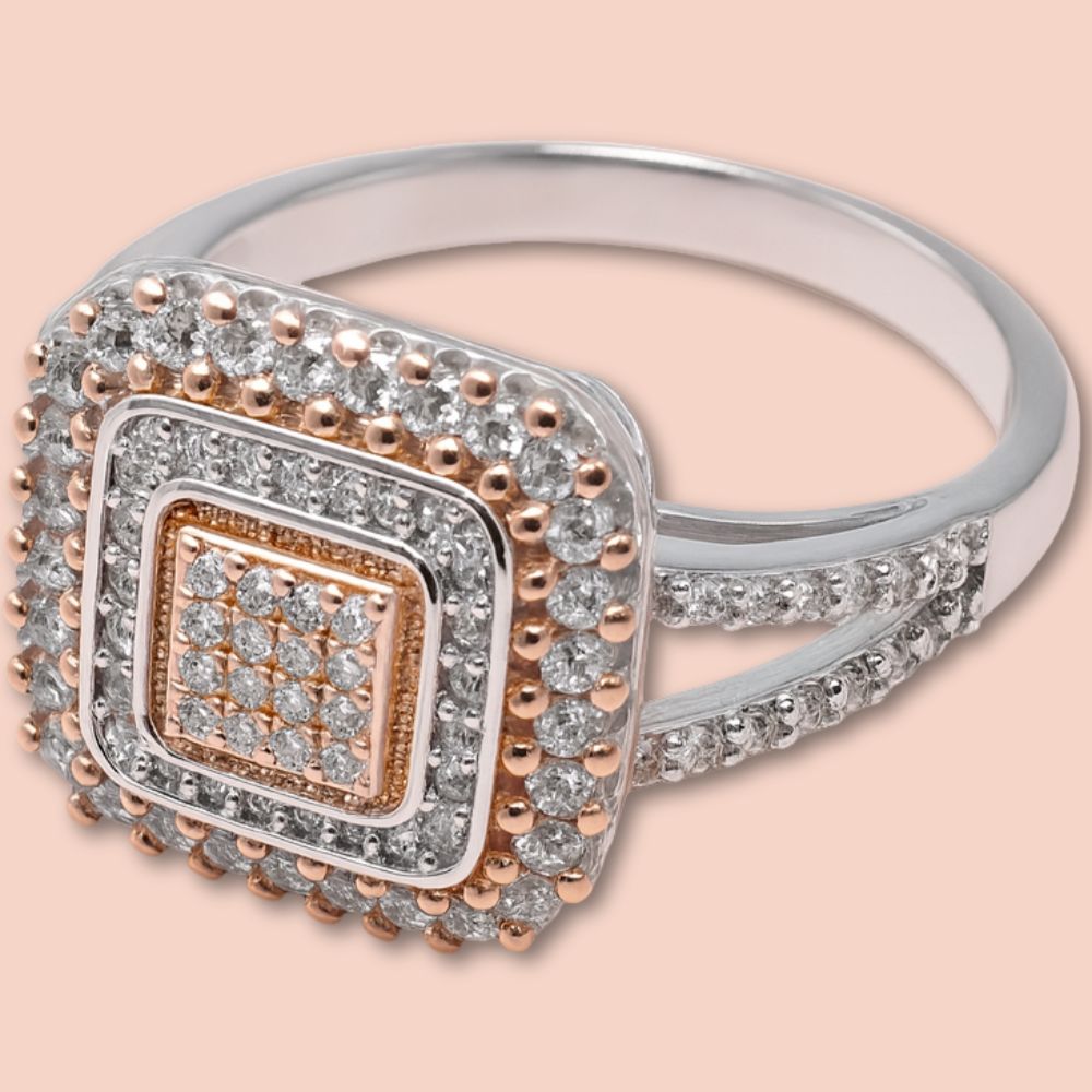The Ring Features A Bold Square-Shaped Design With A Double Halo Of Sparkling Round-Cut. Size-12
