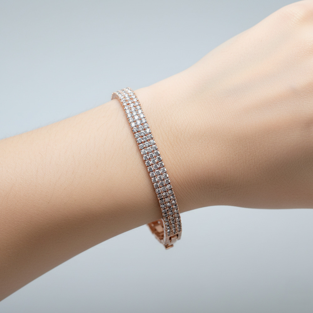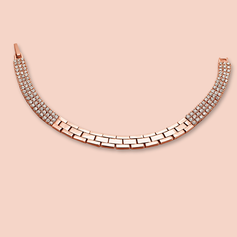 Rose Gold Finish Designed With Rows Of Sparkling Cubic Zirconia Stones.