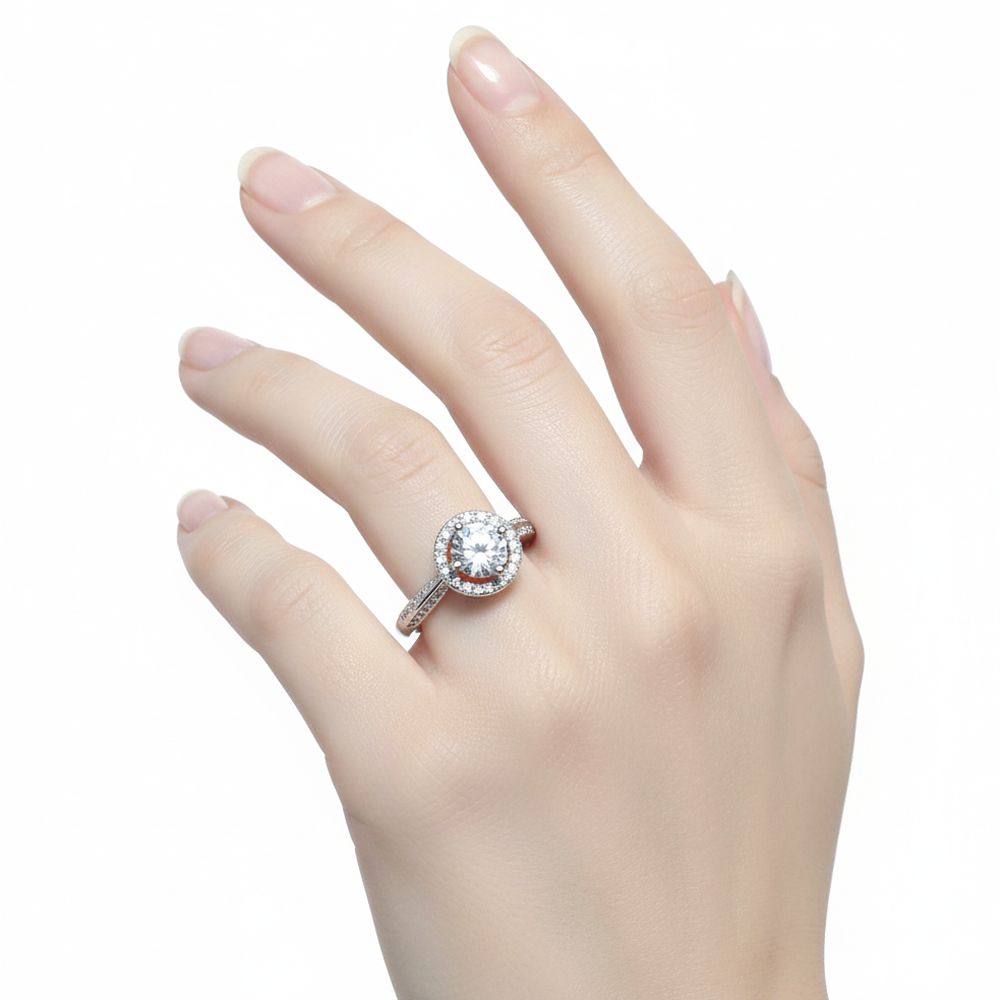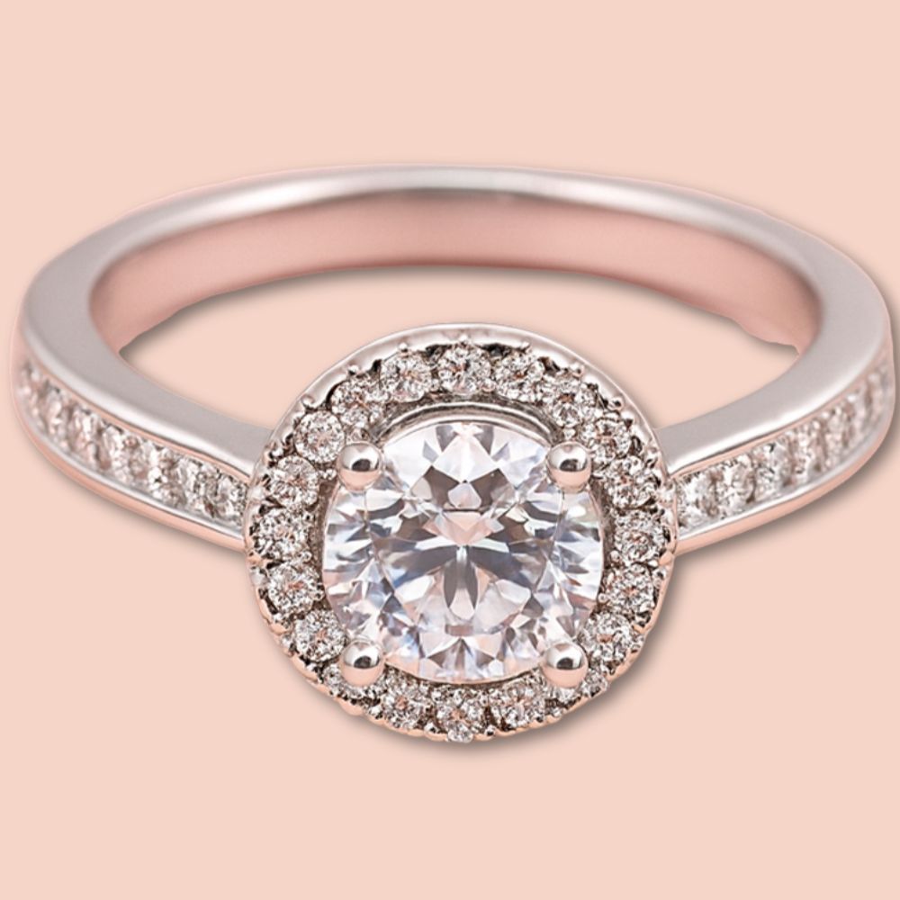 This Halo Engagement Ring Features a Dazzling Round Brilliant-Cut Center Stone Encircled By A Halo Of Sparkling