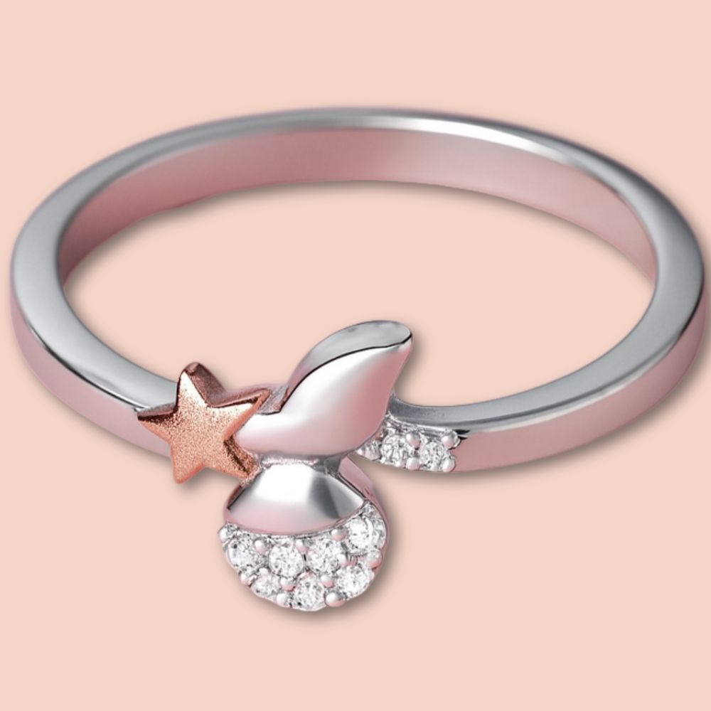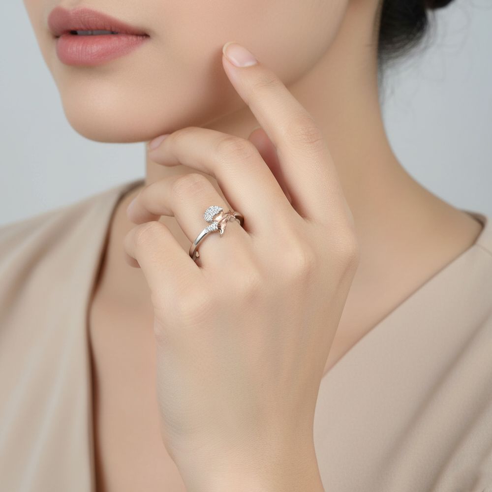 A Charming Two-Tone Designer Ring Crafted In Rose Gold And Silver Finish Moon Set With Sparkling Cubic Zirconia Stones. Size- 14